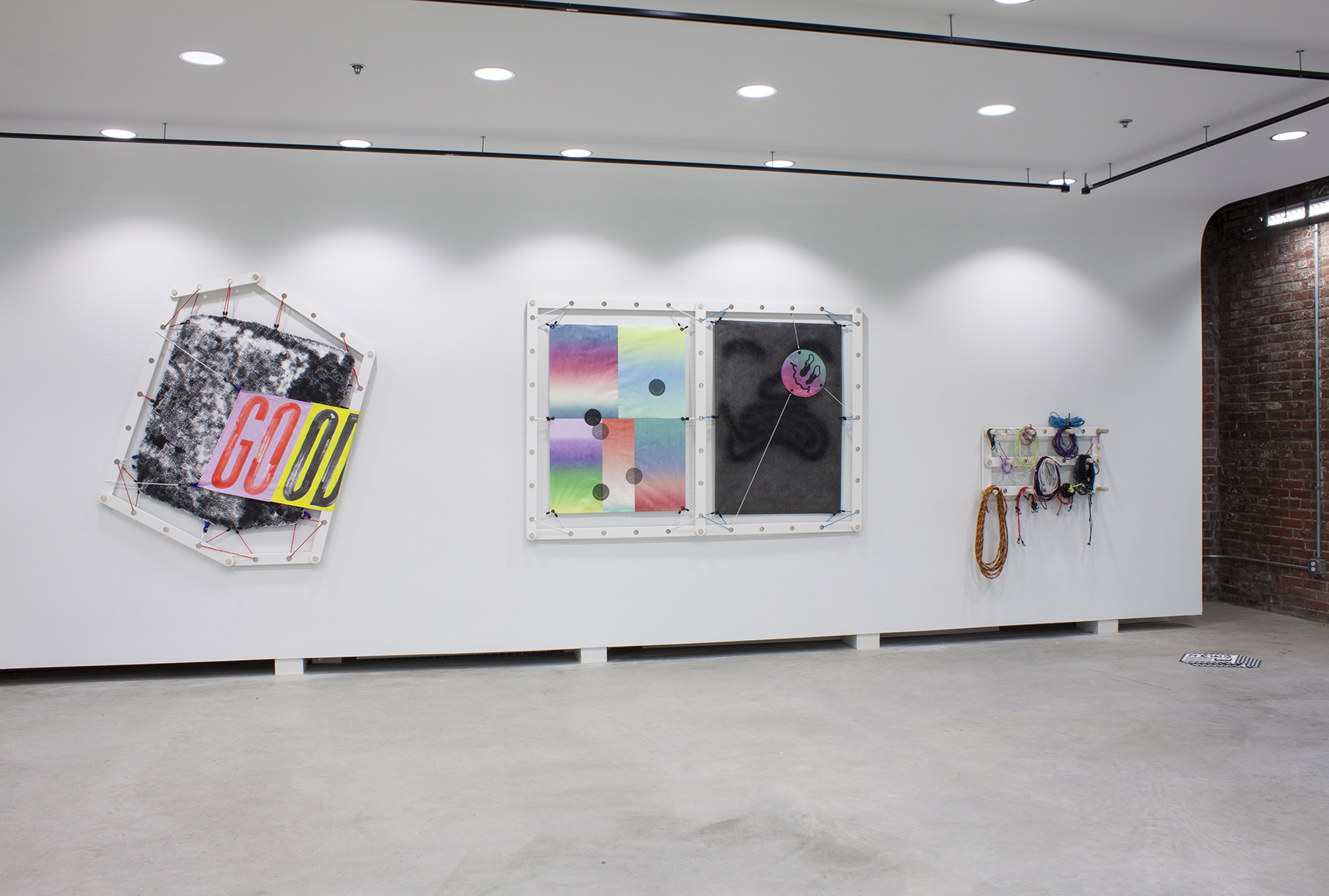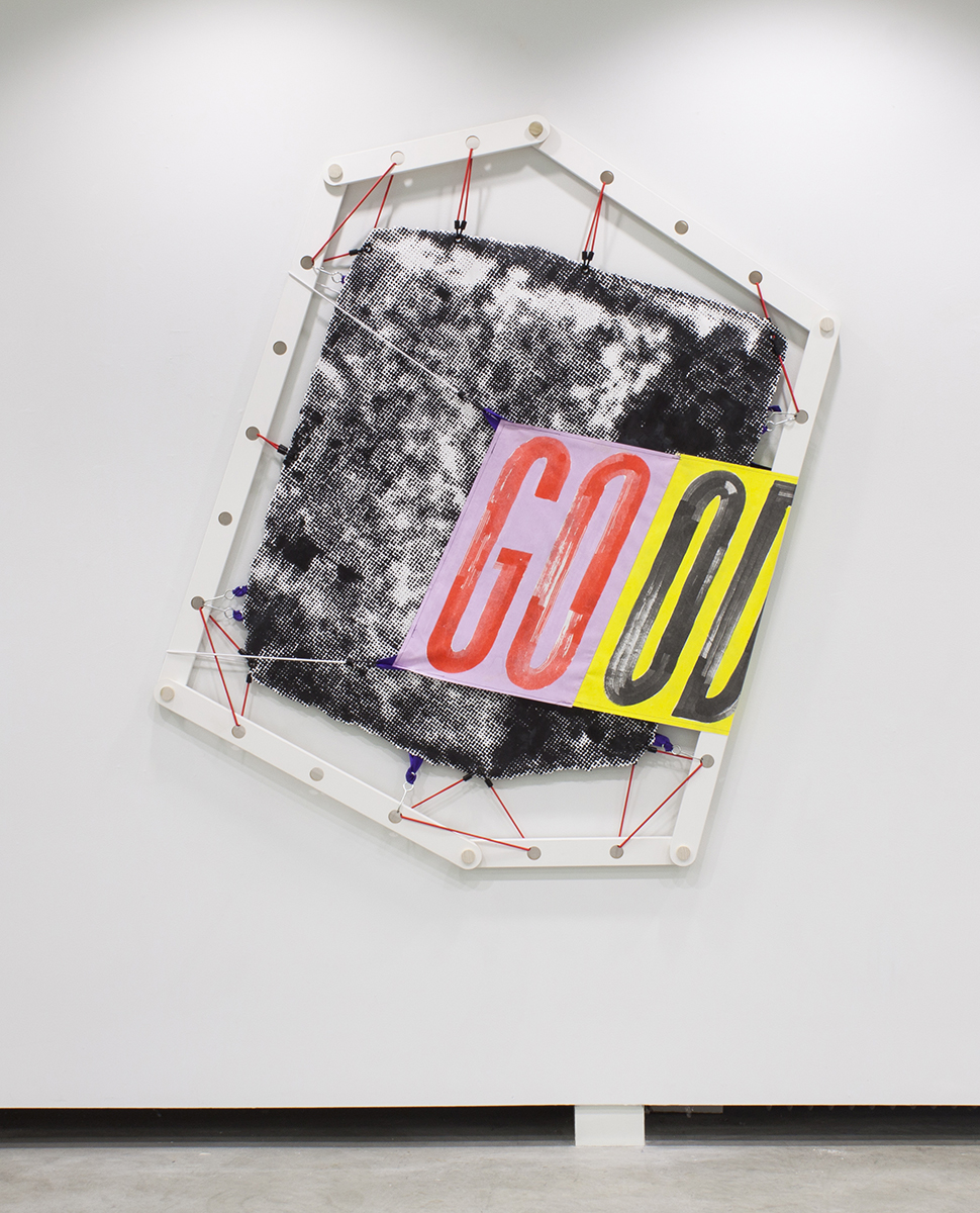 Good. Ink on Tyvek with MDF frame and bungee and paracords, 60" x 48", 2019. |