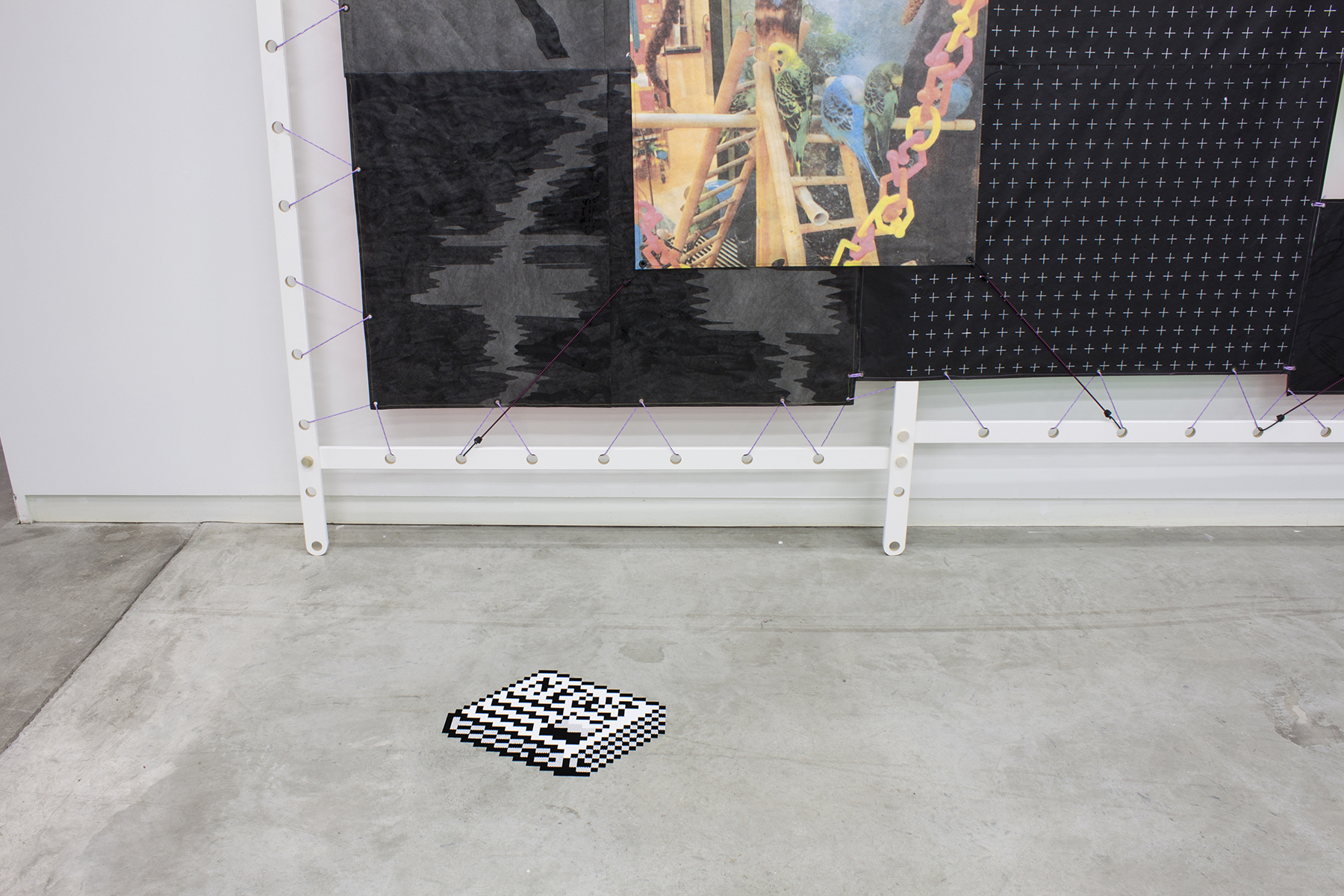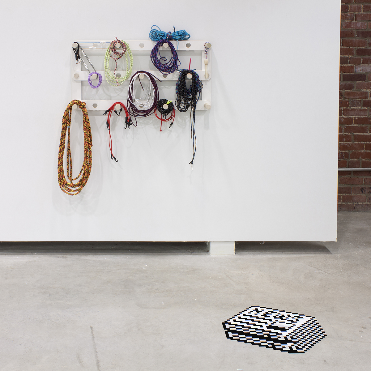 Remains Bungee and paracord on MDF and Poplar frame with screenprinted Phototex stickers, 2019. |
