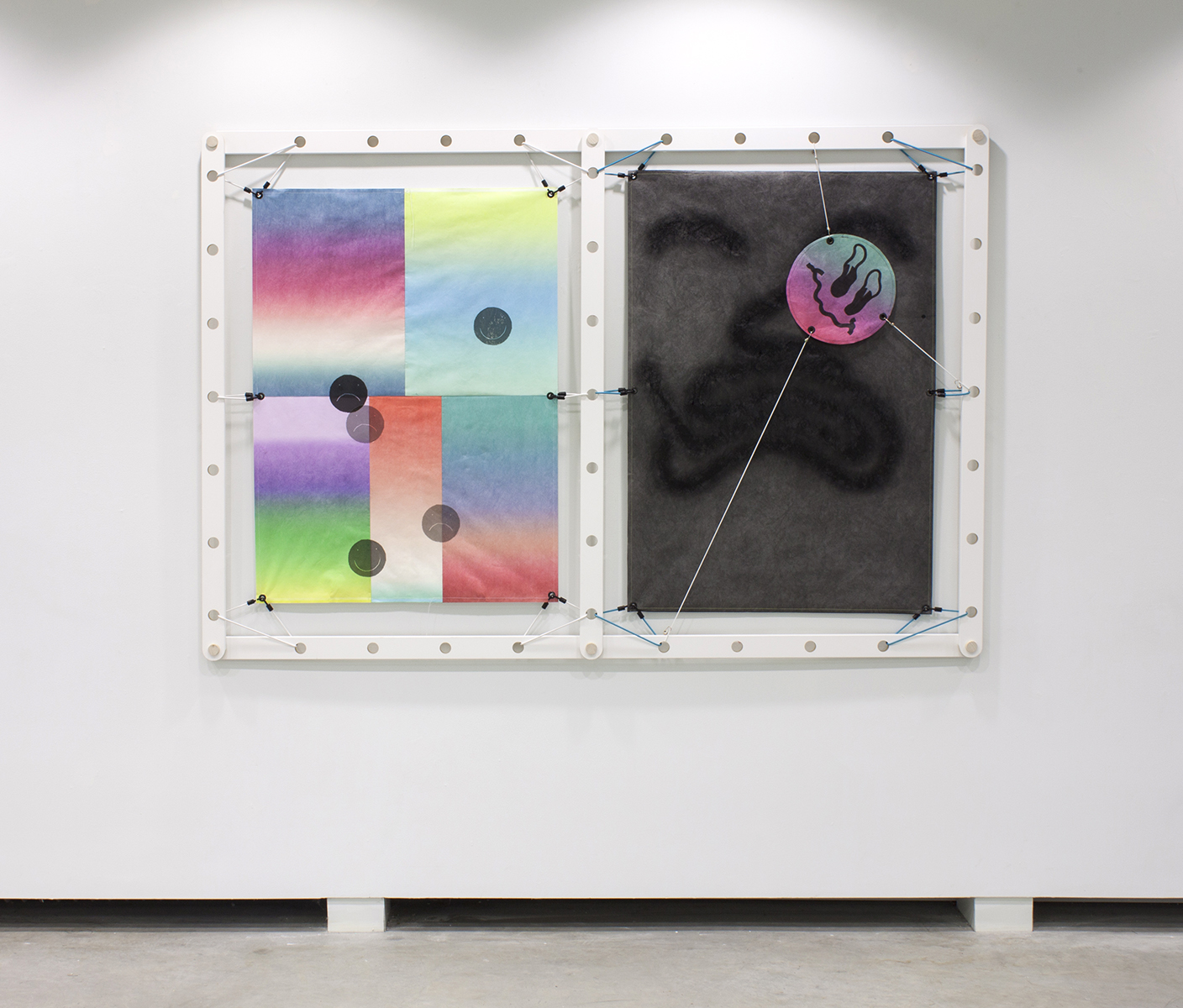 Gradient Smiles Laser printed stickers and spray paint on inkjet-printed and sewn Tyvek in MDF framing with bungee and paracord, 2019. |